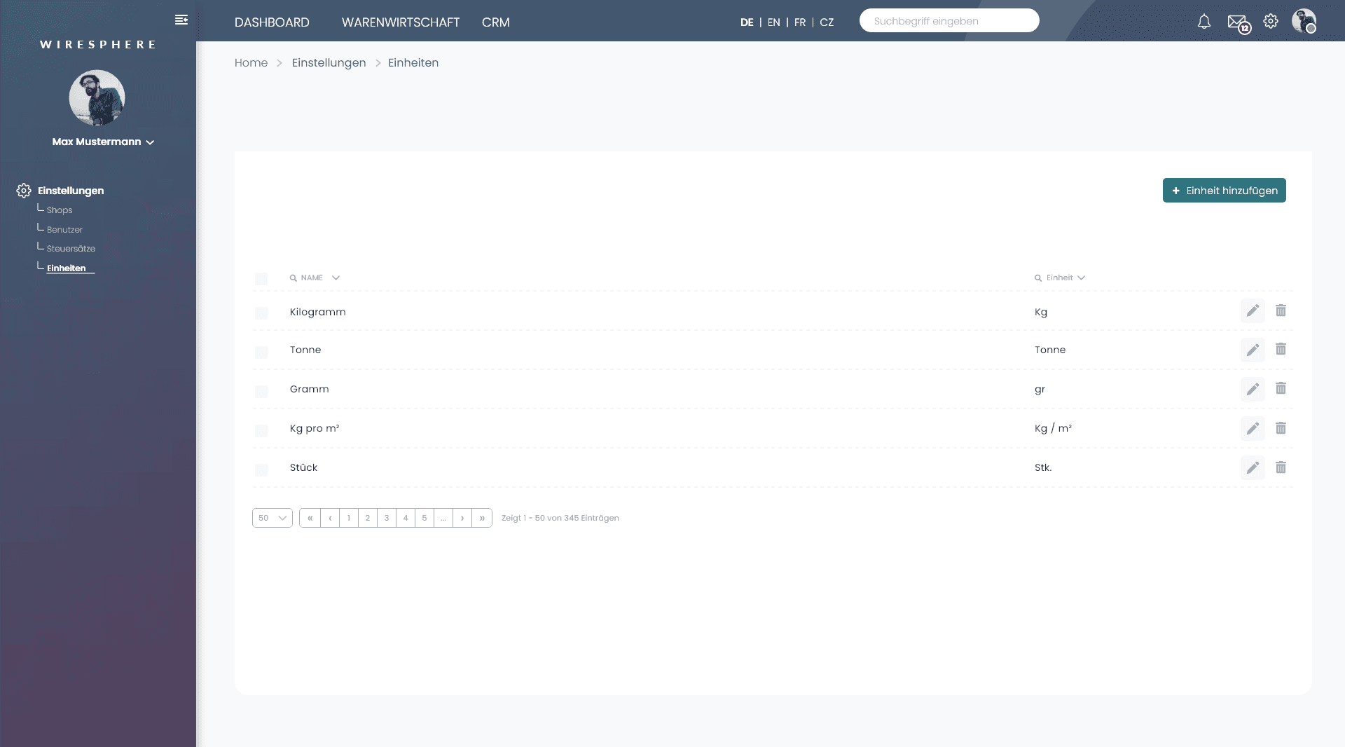 Im Bereich Einheiteneinstellungen können Sie die grundlegenden Maßeinheiten und Standardwerte für Ihr System definieren. Hier legen Sie fest, welche Einheiten (Kilogramm, Stück, etc.) verwendet werden, um eine konsistente und benutzerfreundliche Erfahrung zu gewährleisten.