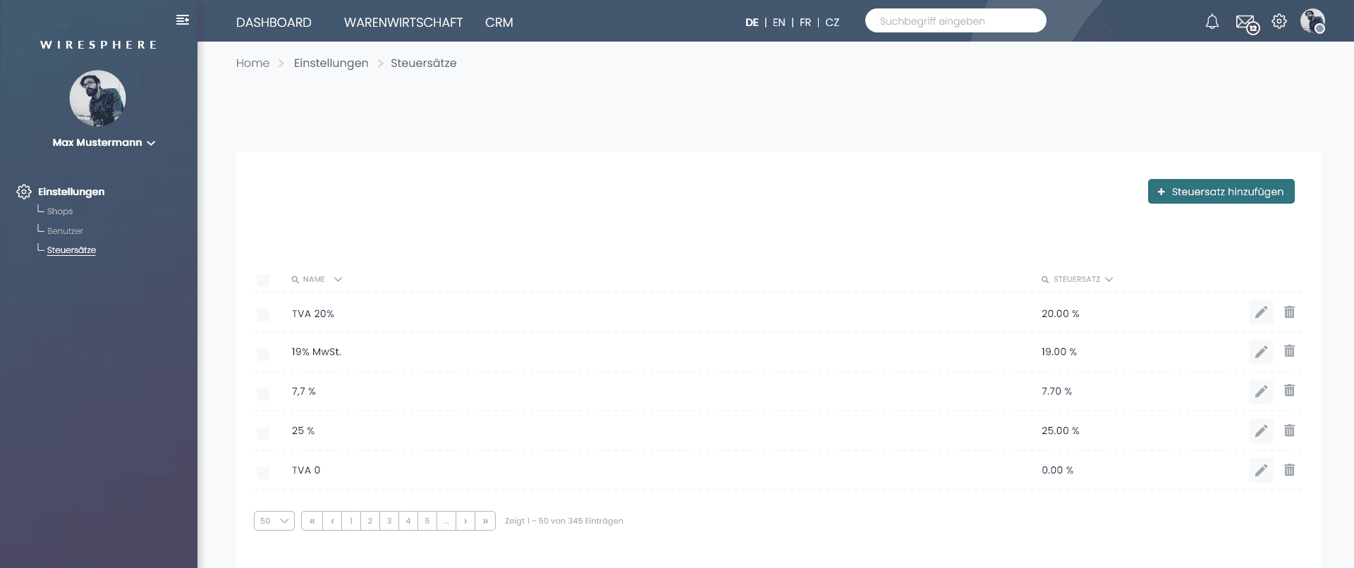Im Bereich Steuersatz-Einstellungen können Sie neue Steuersätze für das Shop-System anlegen. Dies ermöglicht es Ihnen, die Shops in den verschiedenen Sprachen und Ländern mit den passenden Steuersätzen zu versehen.