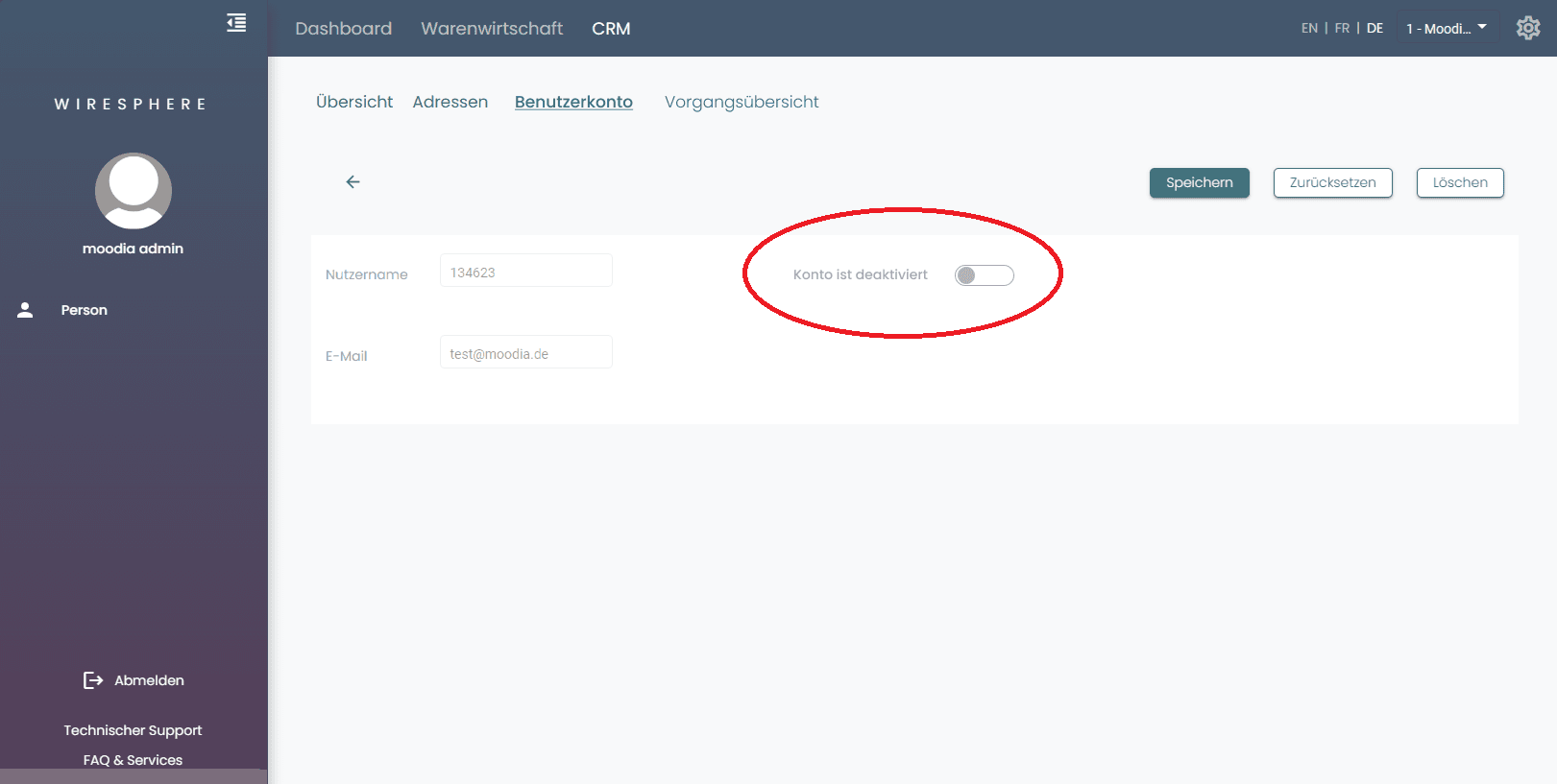 Ist der Schalter aktiviert, wird das Benutzerkonto deaktiviert und der Nutzer kann sich nicht mehr im System anmelden.
