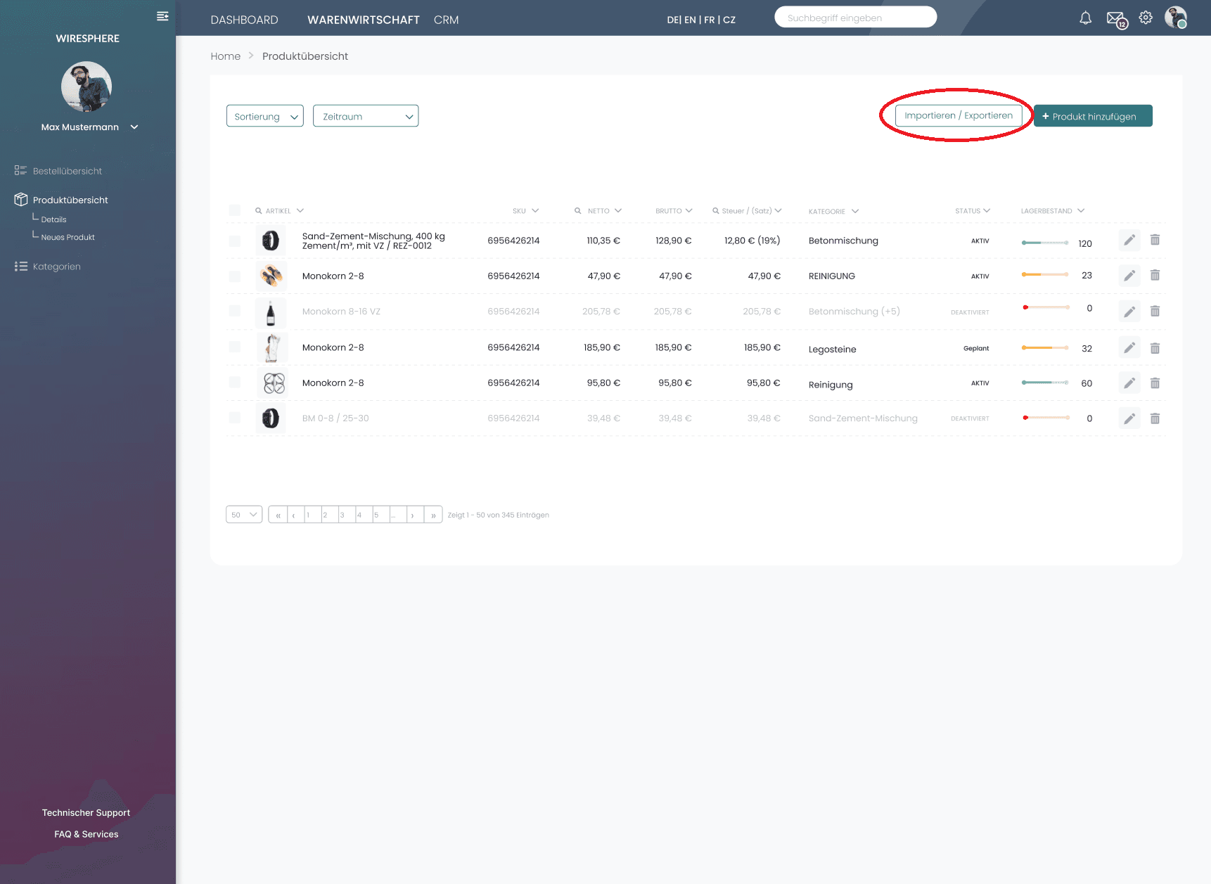 Alle im System gespeicherten Produktdaten können als XLS- oder CSV-Datei exportiert werden. Diese Datei enthält alle relevanten Informationen wie Produktname, Artikelnummer, Preise, Lagerbestand und Kategorien – ideal für Analysen, externe Bearbeitung oder Dokumentation.
